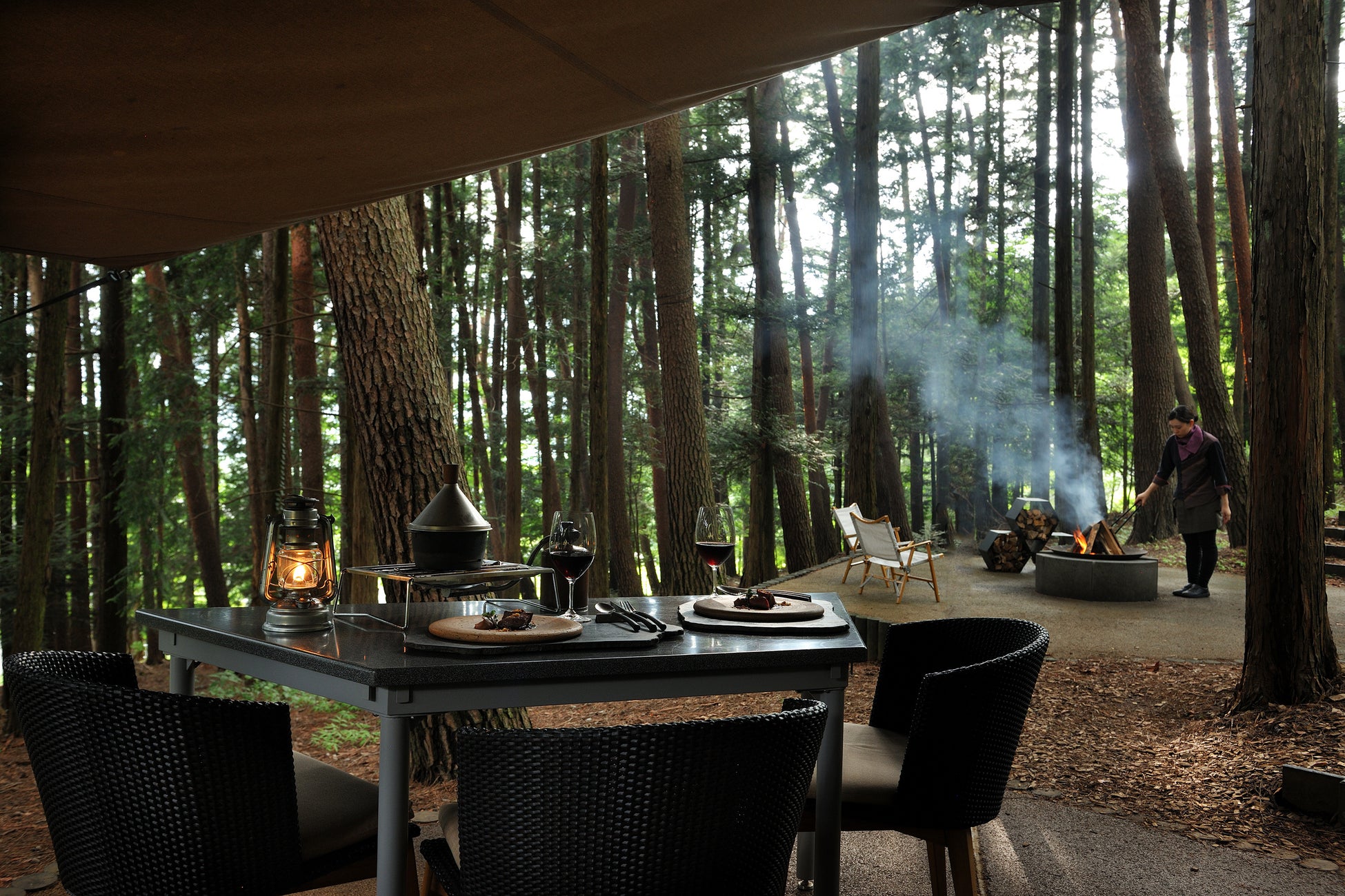フォレストキッチンは、星のや富士の中腹である標高900m程に位置するアカマツの森の中の会場です。木立に囲まれ、風を感じられる場所に、特別な席を用意し、食事を楽しみます。料理の始まりから終わりにかけて変化する景色とともにグランピングマスターとの会話や料理を楽しみます。